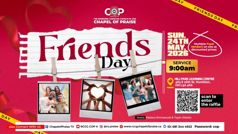 The Redeemed Christian Church of God, Chapel of Praise is a Bible-believing church in Hamilton, Ontario. Our vision is to make a positive impact, transform lives, and empower people to fulfill their God-given destiny. Our mission is to make heaven and by God’s grace take as many people as we can with us. On our website, you’ll be able to watch messages, give, learn about the church and all our upcoming events.